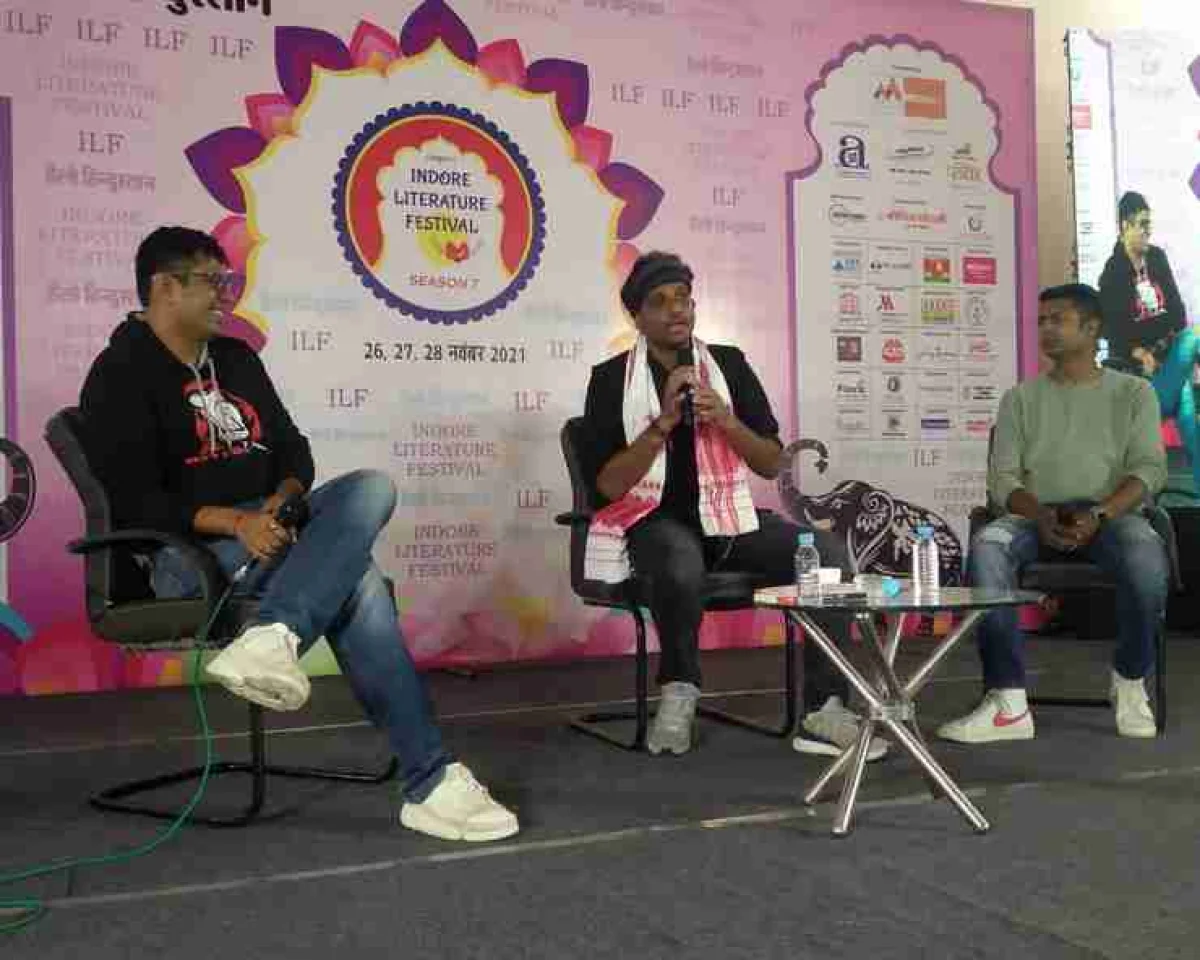 Indore literature festival seconds day 202: 'इंदौर लिटरेचर फेस्टिवल सीजन- 7 के दूसरे दिन के सत्र में दिव्य प्रकाश और संतोष सिंह ने की लेखक नीलोत्पल मृणाल से चर्चा की।