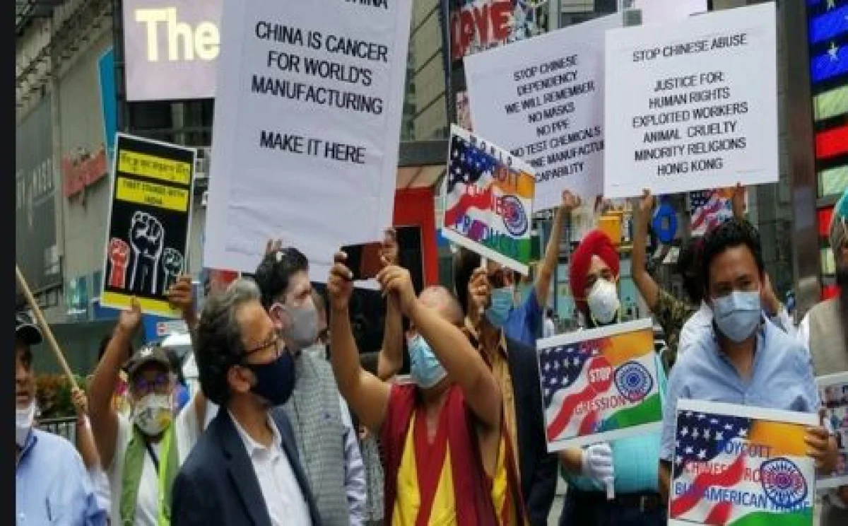 चीन की आक्रामकता और विस्तारवादी नीतियों से तंग लोग अब दुनियाभर में सड़कों पर उतर रहे हैं। न्यूयॉर्क के टाइम्स स्क्वायर पर भारतीय अमेरिकी, तिब्बती और ताइवानी नागरिकों ने चीन के खिलाफ जमकर प्रदर्शन किया। इस दौरान लोग बॉयकाट चाइना और स्टॉप चाइनीज एब्यूज जैसे पोस्टर भी लिए दिखे। दो दिन पहले शिकागो में भी चीन के खिलाफ जबरदस्त प्रदर्शन हुए थे।